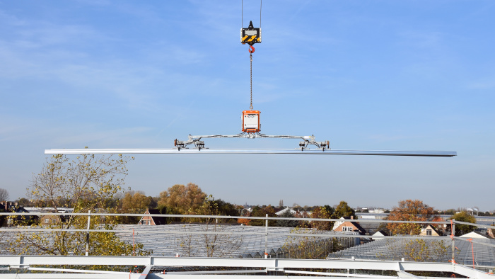 Die Lösung? Eine intelligentere Methode: Vakuum-Hebetechnik. Hierbei werden die Elemente nicht geklemmt oder verzurrt, sondern sicher und ohne Beschädigung mit Saugnäpfen gehalten. In Kombination mit einem Kran wird die Montage selbst der längsten Sandwichelemente zu einem kontrollierten und schnellen Arbeitsvorgang.